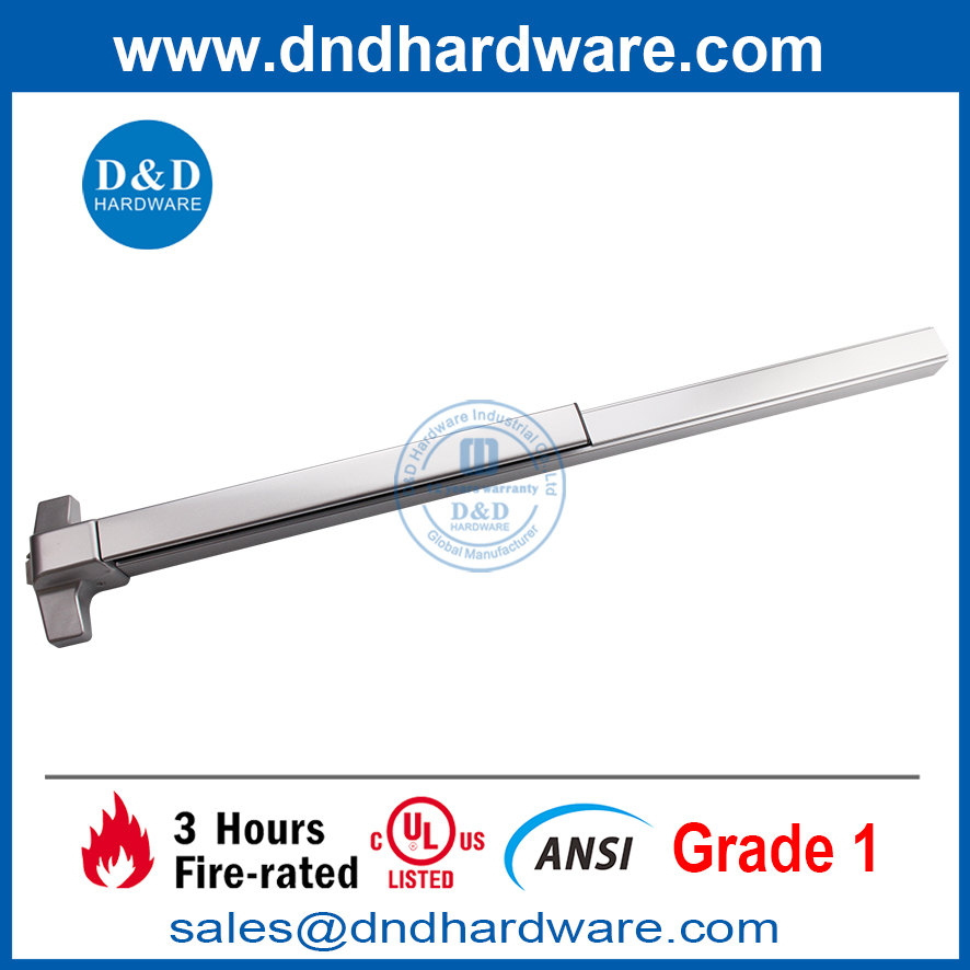 أشرطة UL Fire UL Fire هي أجهزة خروج ذعر عالية الجودة مصممة لاستخدامها على الأبواب المصنفة الحريق. يتم اختبار هذه الأجهزة واعتمادها من قبل مختبرات الاكتتاب لضمان تلبية معايير سلامة صارمة. توفر قضبان الإطفاء UL مخرجًا موثوقًا وآمنًا في حالة الطوارئ.D&D Fire Exit Hardware Bar الذي تم اختباره إلى UL 10C Fire Rated 3 ساعات ، UL FLIE : R40486